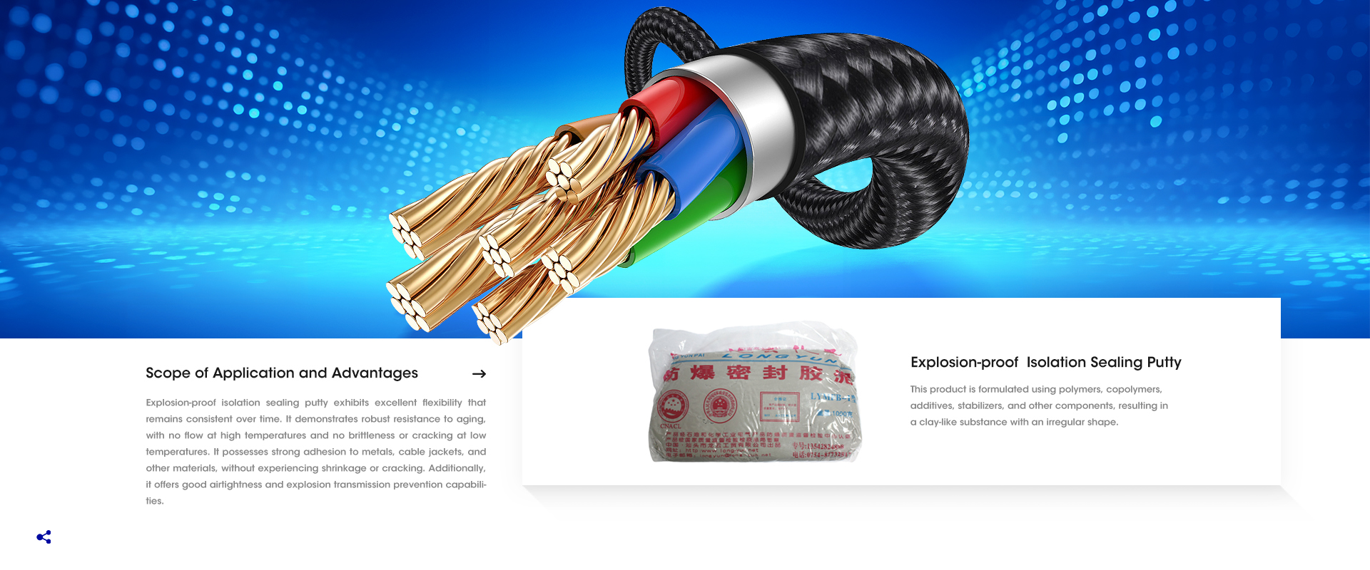 Shantou Longyun Industry and Trade Co ., Ltd . is the first large - scale modern enterprise which specialized in producing explosion - proof sealing materials in China . The company has been established for more than two decades with a group of professional technical personnel and advanced production facilities . The products include explosion - proof sealing daub , explosion - proof and fireproof materials , AB cable sealing filler , powder sealing filler , cable connectors insulating explosion - proof and sealing tape , special ventilation flame - resisting sealing tape , hot melt butyl sealing tape used for hollow glasses , butyl waterproof sealing tape specialized for color board and PC board , butyl sealing tape , expansion tape and ...